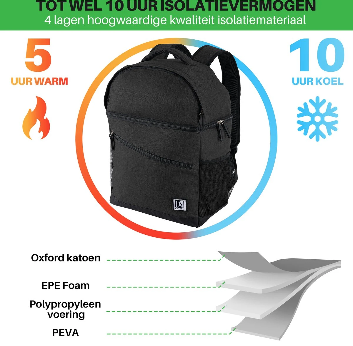 De koelrugzak van Brisby is onderverdeeld in 2 hoofdvakken. het onderste vak is voorzien van een isolatie van vier lagen, hierdoor blijven producten tot wel 10 uur op temperatuur. In het bovenvak is genoeg ruimte voor bijvoorbeeld je portomonee, telefoon, sleutels en een nieuw shirt of een handdoek.