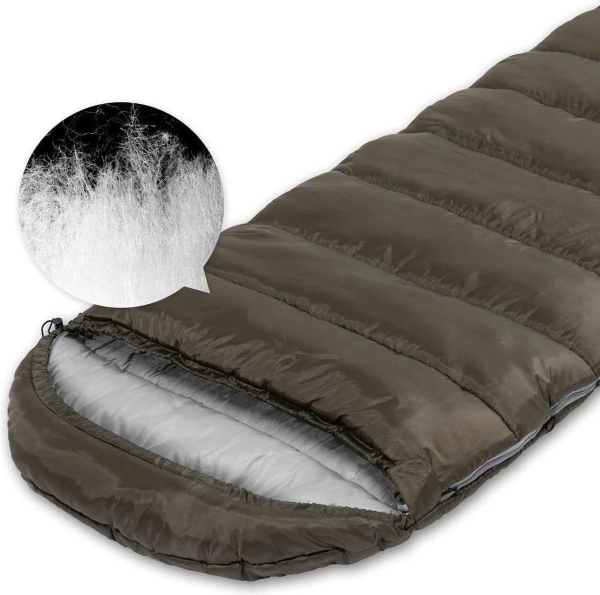 Een enkele laag van synthetisch materiaal (waterafstotend 190-T polyester) zorgt ervoor dat de slaapzak comfortabel warm blijft.