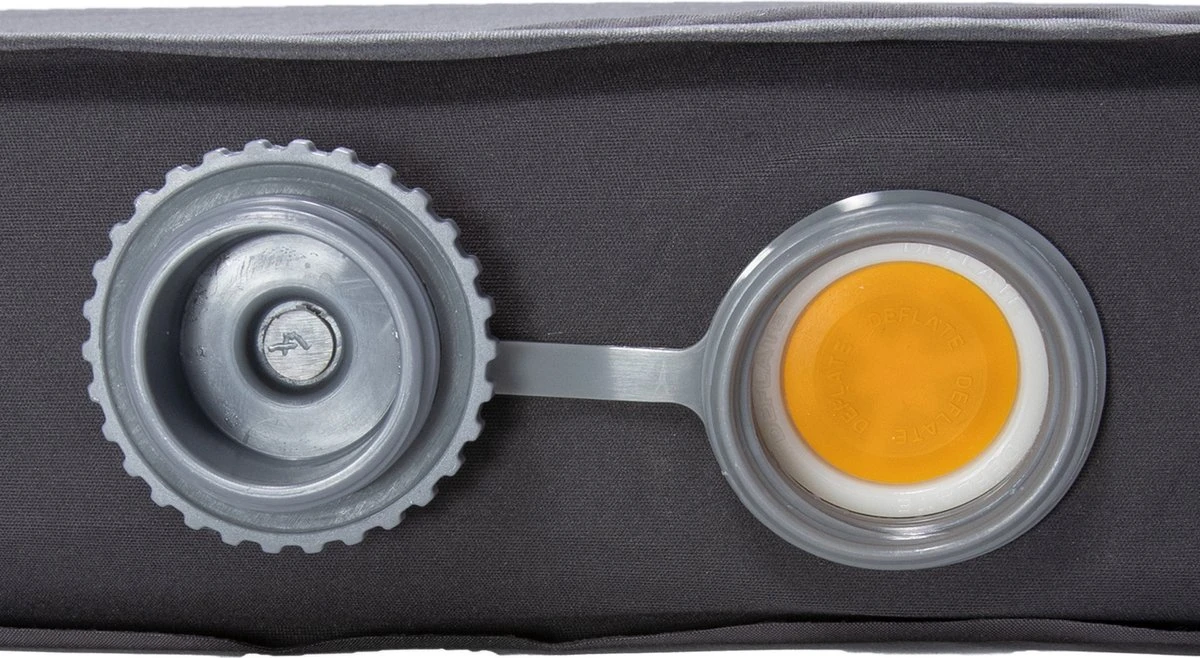 Deze mat heeft één groot ventiel waarmee je de mat zowel opblaast als leeg laat lopen. Het ventiel heeft 3 standen: Open, inflate (om bij te blazen, met het oranje gedeelte aan de binnenkant) of deflate (met het oranje gedeelte aan de buitenkant). Je draait ‘m gemakkelijk met je vinger naar de gewenste stand.